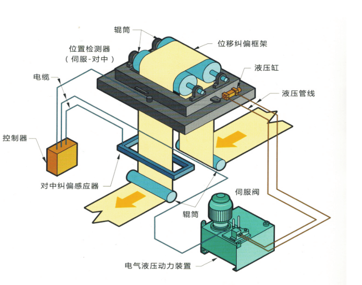 中间辊CPC对中纠偏依靠固定偏移中心的纠偏机架绕其中心发生偏转,使带材发生侧移或者横移进行纠偏。为了获得最佳效果,应保证进出口带材都垂直于纠偏机架运动平面,并且检测装置布置于纠偏辊出口尽量靠近纠偏机架。